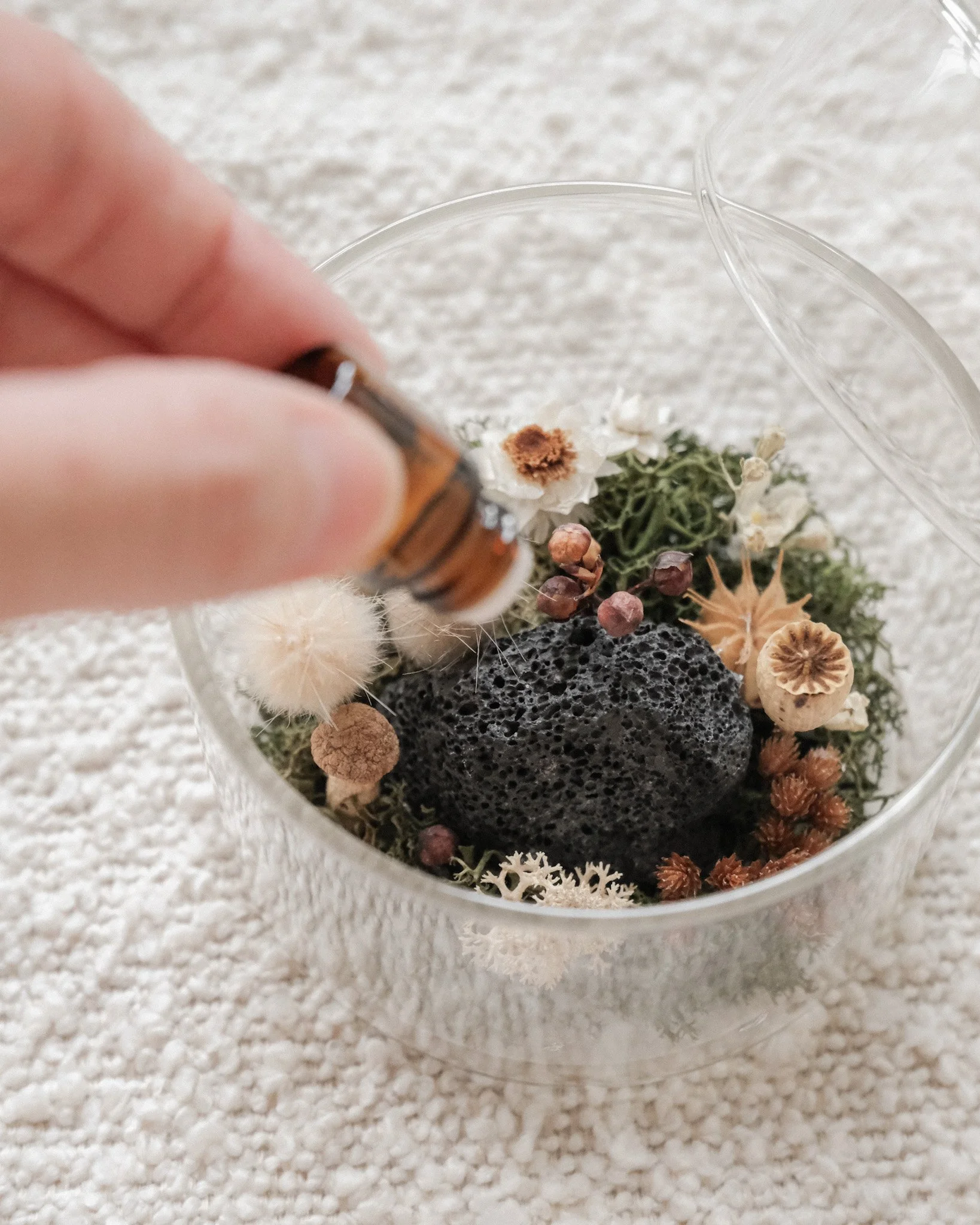 Tucked within this piece is a small lava rock, waiting to be infused with a few drops of my favourite scent — Oolong Peach Tea*. Simply add a couple of drops to the stone, and let the soft notes of tea and fruit drift through your space, creating a soothing atmosphere that feels both refreshing and familiar. Place it by your bedside, on a work desk, or in a cozy corner, and let it serve as a gentle reminder of stillness, scent, and simple beauty. *Comes with a 10ml Oolong Peach Tea aroma oil to complement your piece.